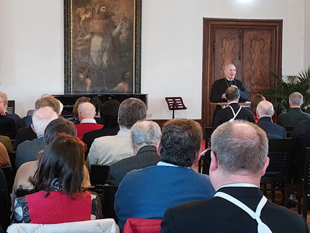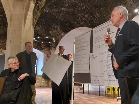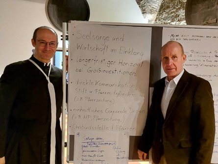 Repräsentanten der zum Stift Klosterneuburg gehörenden Pfarren waren zum Gedankenaustausch in den Augustinussaal und den Binderstadl eingeladen. Zunächst informierte Prälat Maximilian J. Fürnsinn CanReg über die aktuelle Situation im Stift, ohne dabei mit Selbstkritik zu sparen. In den Mittelpunkt seiner Predigt der abschließenden Hl. Messe in der Stiftskirche stellte er den Gedanken, dass die Pfarrgemeinden Orte der Sammlung sein sollen und einen Fokus bilden, um den herum sich etwas entwickelt. Ähnlich brachte sich auch Pater Reji zuvor in die Diskussion mit Mitgliedern anderer Stiftspfarren ein. Er meinte, dass pfarrliche Veranstaltungen, konkret nannte er dabei das erst kürzlich stattgefundene Pfarrschiwochenende in Krieglach, nicht nur die engere Pfarrfamilie ansprechen, sondern auch die erweiterte und so Interesse am Pfarrleben und für liturgische Feiern geweckt werden. Tage der Stiftspfarren soll es auch in Zukunft geben, um den Dialog zu fördern und etwaige Synergien besser nutzen zu können.