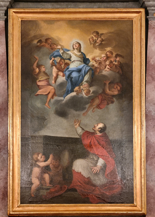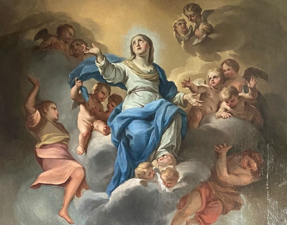 Das Mitte Februar ins Atelier gebrachte Bild des Marienaltars kehrte nun nach dessen restauratorischen Reinigung wieder an seinen angestammten Platz zurück. Es zeigt die Gottesmutter Maria, wie sie auf Wolken, umgeben von einer Schar von Engeln, in die Herrlichkeit des Himmels getragen wird. Zu ihren Füßen kniet vor einer Balustrade der hl. Karl Borromäus. Er trägt Kardinalskleidung, vor ihm liegt ein Kardinalshut, dessen Quasten vor der Reinigung fast nicht mehr erkennbar waren. Neben ihm befinden sich zwei Engel, von denen einer eine Mitra hält. Neben der hl. Maria kam sogar ein bis dahin übermalter Engel zum Vorschein.