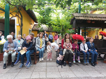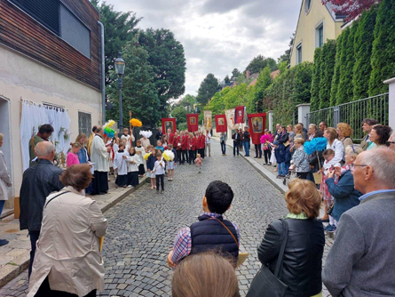 den Ministranten, der Musikkapelle, gefolgt von einer großen Schar Gläubiger in den Rosenhof des Weingutes Wolff zur Eucharistiefeier. Danach ging es zum Kinderaltar beim Haus der Familie