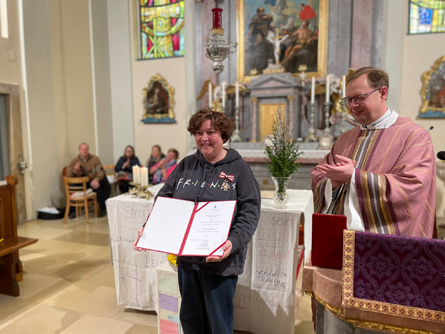 Es war ein bestens gehütetes Geheimnis, das sich am 4. Fastensonntag in unserer Pfarrkirche ereignete. Selbst als Herr Pius Reinhard Feiler, Zeremonienmeister im Chorherrenstift Klosterneuburg, mit dem Auto in den Pfarrhof einbog, ahnte noch niemand den Grund seines Kommens. Selbst jene Person nicht, die sogleich im Mittelpunkt stehen sollte, hatte keine Ahnung - Bettina Schilling Unifußer. Seit Jahren ist sie der Kreativgeist der Pfarre. Ob die Gestaltung des Pfarrheimtores, Familienmessen, Kinderkirche, Sternsingeraktion, Vorlesecafé, Firmvorbereitung, Pfarrfamilywochenende oder Come2stay – es gibt fast nichts in unserer Pfarre, das sie nicht initiiert hat, unterstützt, oder mit ihren Ideen bereichert. Ohne ihren Einsatz wäre unsere Pfarre weniger bunt und wohl auch kaum beachtet. Für ihre Verdienste erhielt sie nun anlässlich eines runden Geburtstages das Leopoldskreuz in Bronze verliehen.