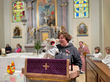 Das Leopoldskreuz wurde 1985 unter Prälat Gebhard Koberger vom Kapitel des Stiftes Klosterneuburg als tragbare Form einer Dankauszeichnung ins Leben gerufen. Die Auszeichnung dient der öffentlichen Anerkennung besonderer Leistungen für das Stift Klosterneuburg und somit auch als Dank für unermüdliches Arbeiten in den Stiftspfarren, wie auch Neustift eine ist. Das Leopoldskreuz wird sowohl Priestern als auch Laien verliehen. Am 10. März wurde eben Bettina Schilling Unifußer für ihre Verdienste um unsere Pfarre damit ausgezeichnet. Und da der Gottesdienst, wie zumeist bei Familienmessen, äuerst gut von jungen Kirchengehern besucht war, bekam auch die Schafshandpuppe Schorsch noch einen Auftritt. Schorsch übersetzt Schriftlesungen und Predigten in eine kindergerechte Sprache und begehrte dafür sodann auch gleich eine Auszeichnung. Bis es aber so weit ist, wird es wohl noch sehr lange dauern, da es dafür wohl mehrerer Statutenänderungen bedarf.