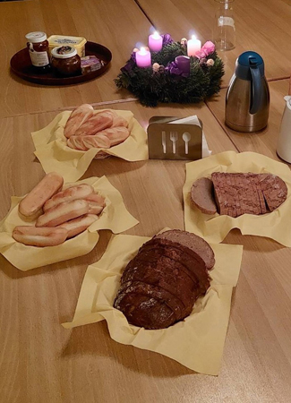 Nach dem feierlichen Gottesdienst versammelten sich die Messbesucher im Pfarrsaal zu einem herzhaften Frühstück. Dieses gemeinsame Essen förderte