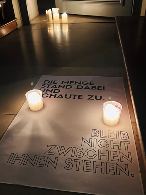 Diesmal standen drei Kreuzwegstationen im Mittelpunkt (Nr. 4, 5 und 6), die alle auf das Themenfeld helfen/mitleiden/dasein ein Schlaglicht werfen. Minimal beleuchtet mit unglaublich tiefsinnigen Worten und wunderbarer Musik war unsere Kirche wieder ein Ort der Stille und Mediation.