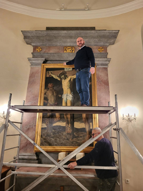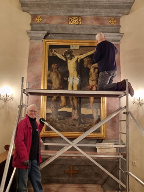 Am 14. Februar 2025 wurde das restaurierte Bild wieder an seinem Platz montiert, und wir freuen uns, dieses Stück unserer Kirchengeschichte in voller Schönheit zu präsentieren. Ein herzliches Dankeschön gilt allen tatkräftigen Helfern, die bei der Demontage und Montage des Bildes sowie der Kirchenbänke mit angepackt haben. Ohne ihr Engagement und ihre Unterstützung wäre dieses Projekt nicht möglich gewesen.