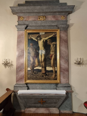 Das beeindruckende Kreuzbild am Seitenaltar, das 1930 von dem Künstler Max von Poosch gemalt wurde, erstrahlt nach sorgfältiger Reinigung und Restaurierung durch die fachkundige Firma Mag. art. Alicja Dabrowska wieder in seiner ursprünglichen Pracht. Während der Restaurierung wurde zudem ein Kabel, das zuvor unschön vor dem Altar angebracht war, fachgerecht hinter dem Altar verlegt, um das ästhetische Gesamtbild zu verbessern.