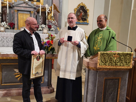 P. Reji überreichte ihm den von Heiligen Vater Papst Leo XIV erteilten APOSTOLISCHEN SEGEN und Oberministrant Thomas Natschläger übergab ihm den von Prälat Anton Höslinger Can.Reg. vom Augustiner Chorherrenstift Klosterneuburg als Zeichen des Dankes und der Anerkennung verliehenen LEOPOLDPFENNIG in SILBER.